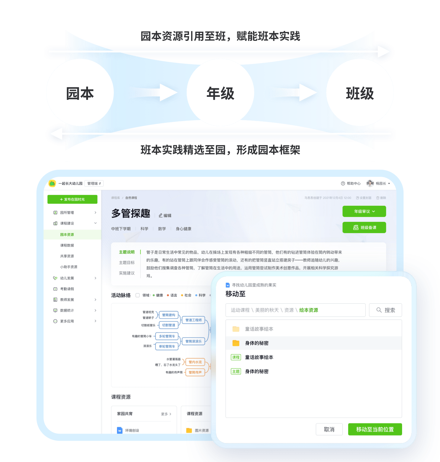 实现资源灵活调取和整合省去了大量重复劳动的时间,实现一事多效,提升园本课程资源管理效能。