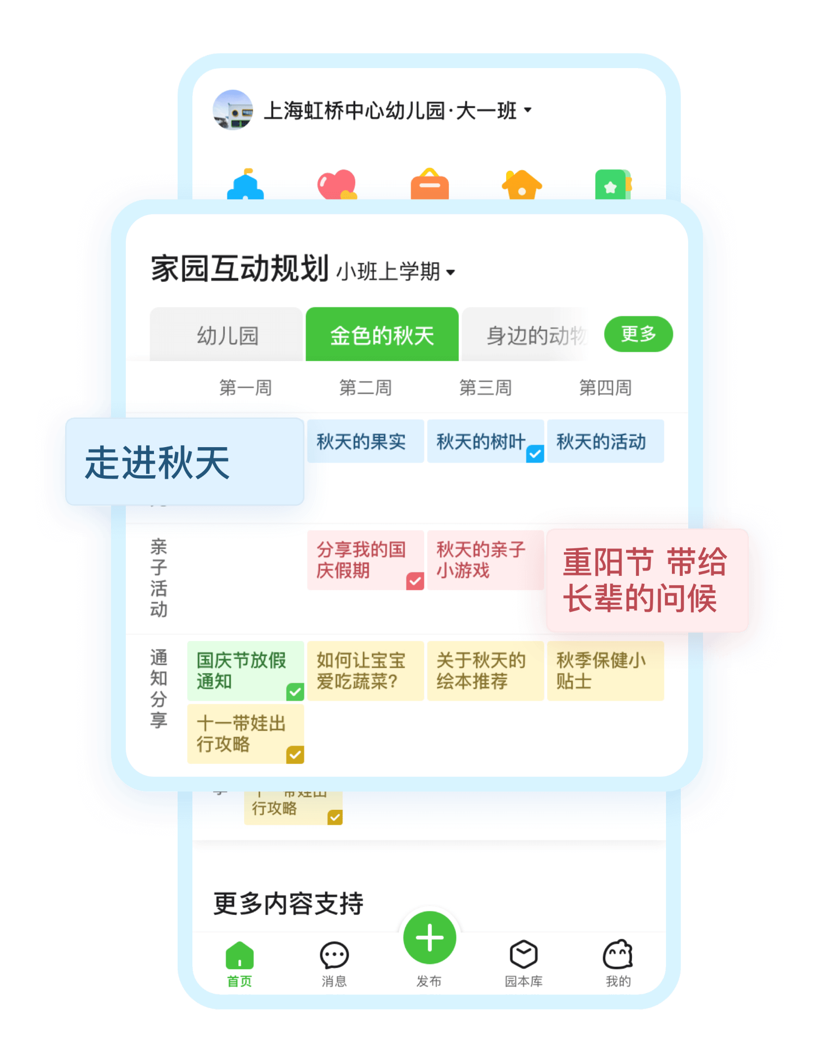 提供“在园时光”“亲子活动”“通知”“分享”多种内容资源,丰富的案例帮助教师和家长更好地读懂儿童,支持成长。