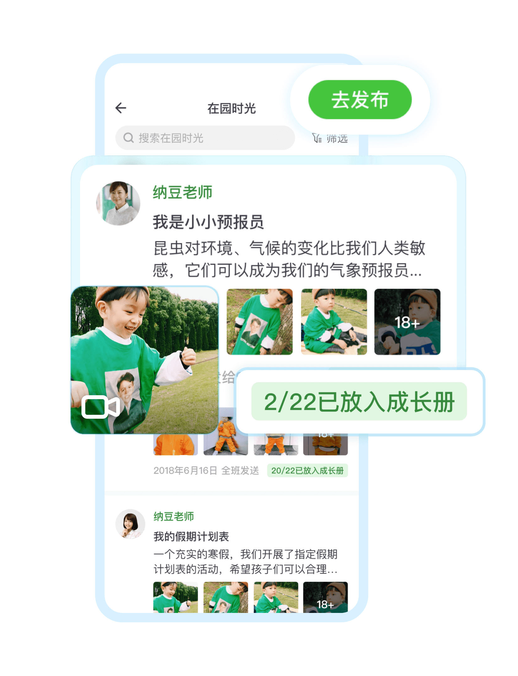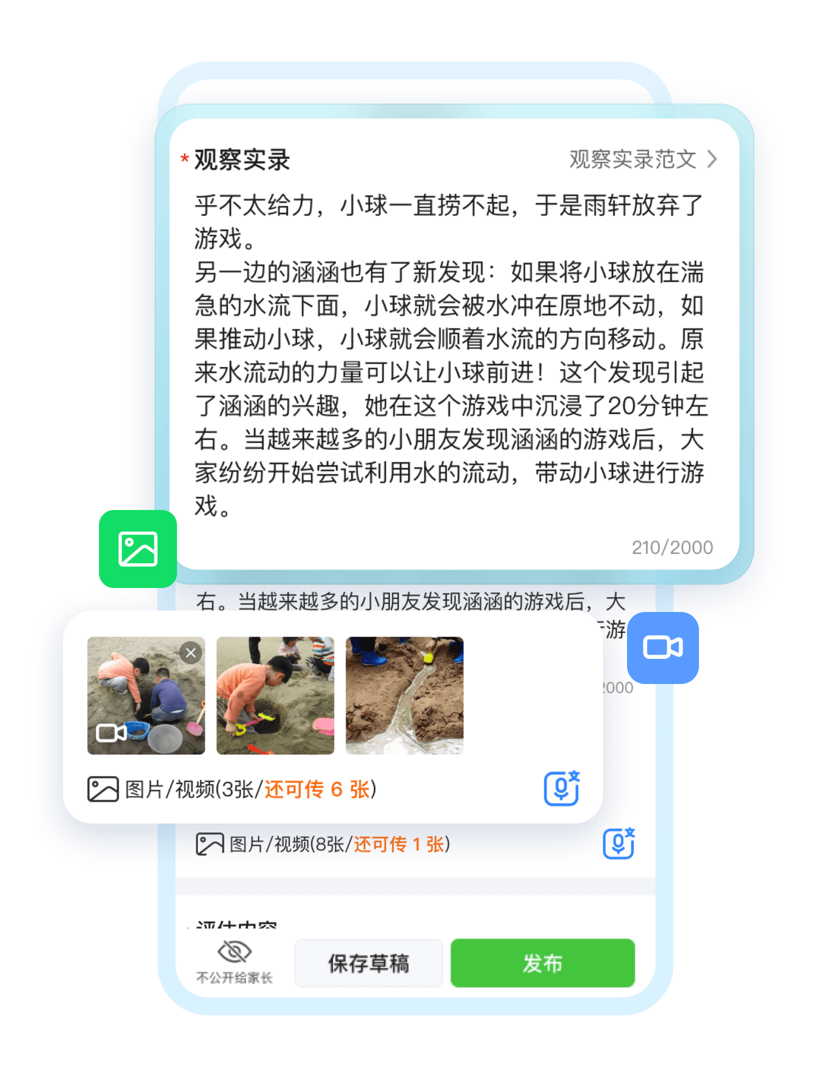 视频+图片+文字,多种记录形式便于教师向家长展示幼儿园的活动细节及教育意义。