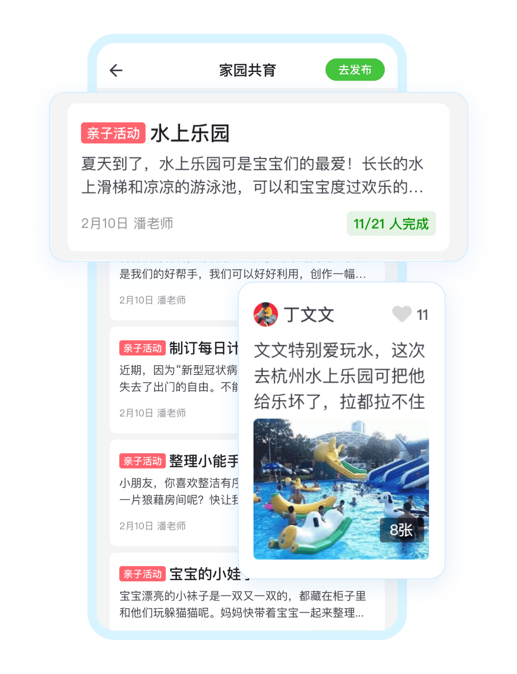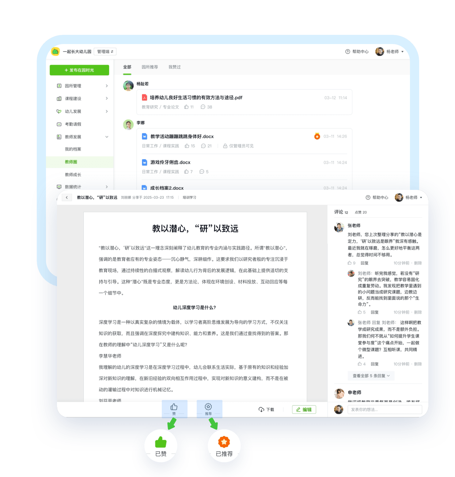 支持将个人日常工作精彩片段、过程性成果资料和保教成果进行分享,并支持全员老师点评互动。