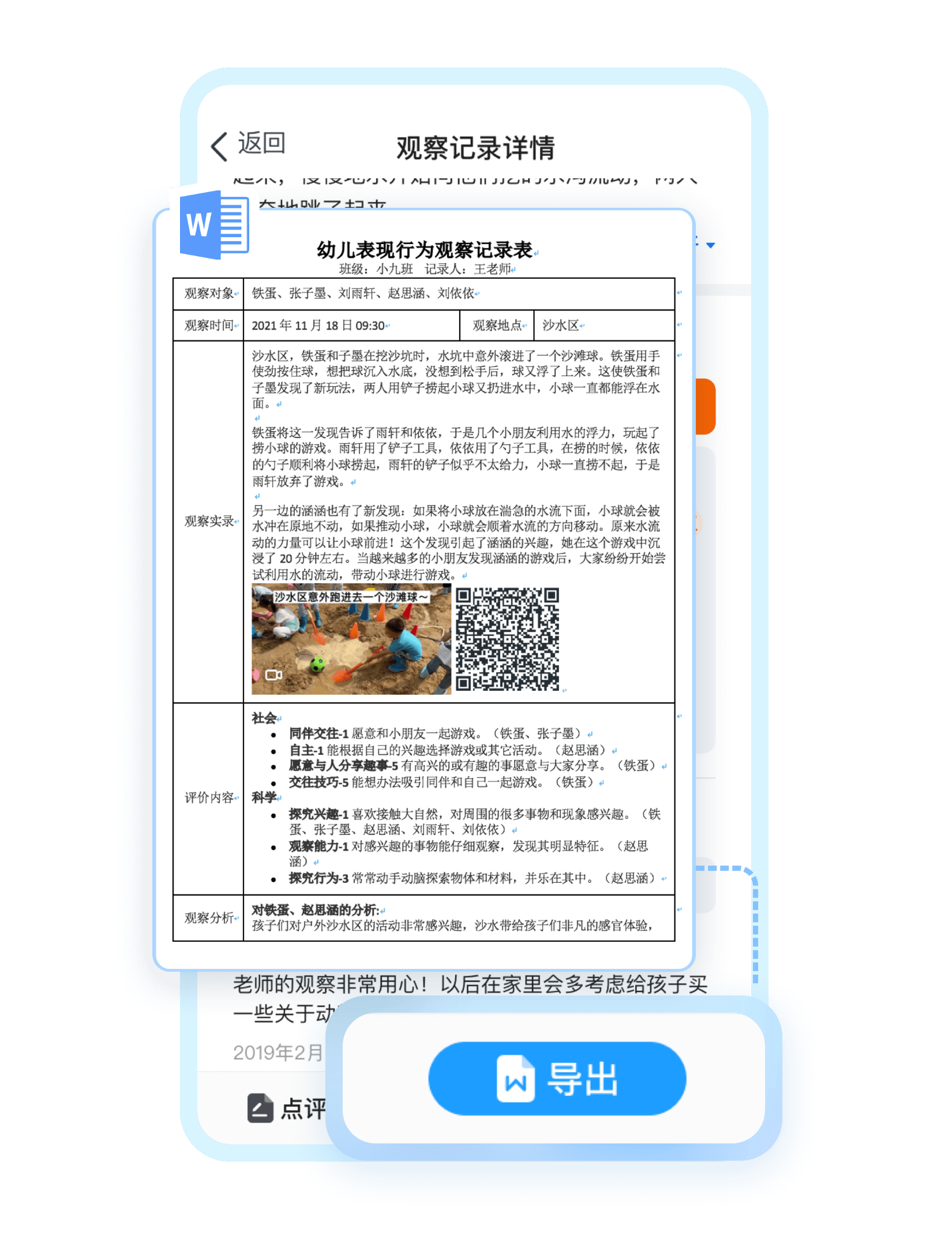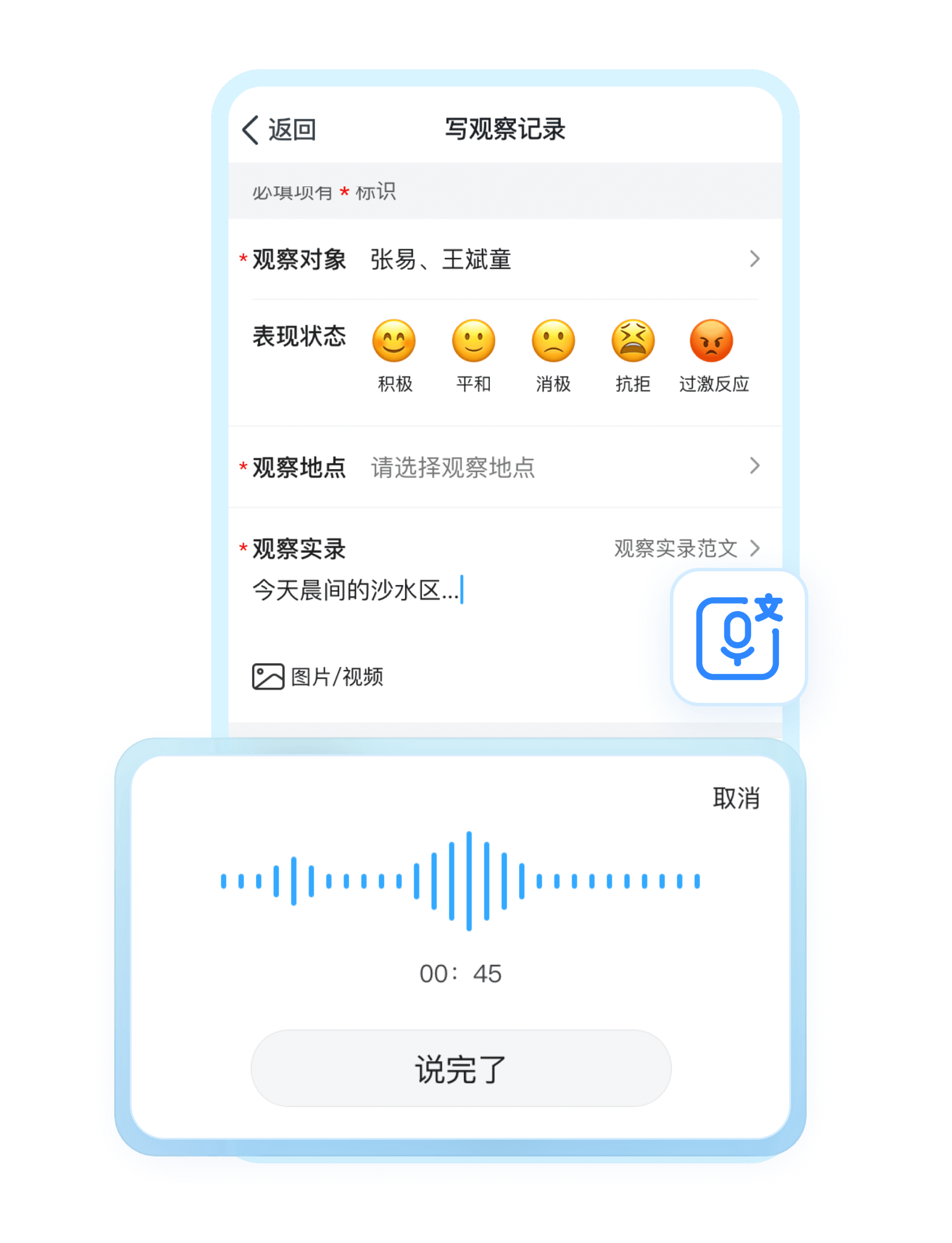 教师通过语音的方式,记录下幼儿活动中的关键行为,保证记录的及时性;平台自动将语音转换成文字,方便教师补充整理,保证记录的完整性。