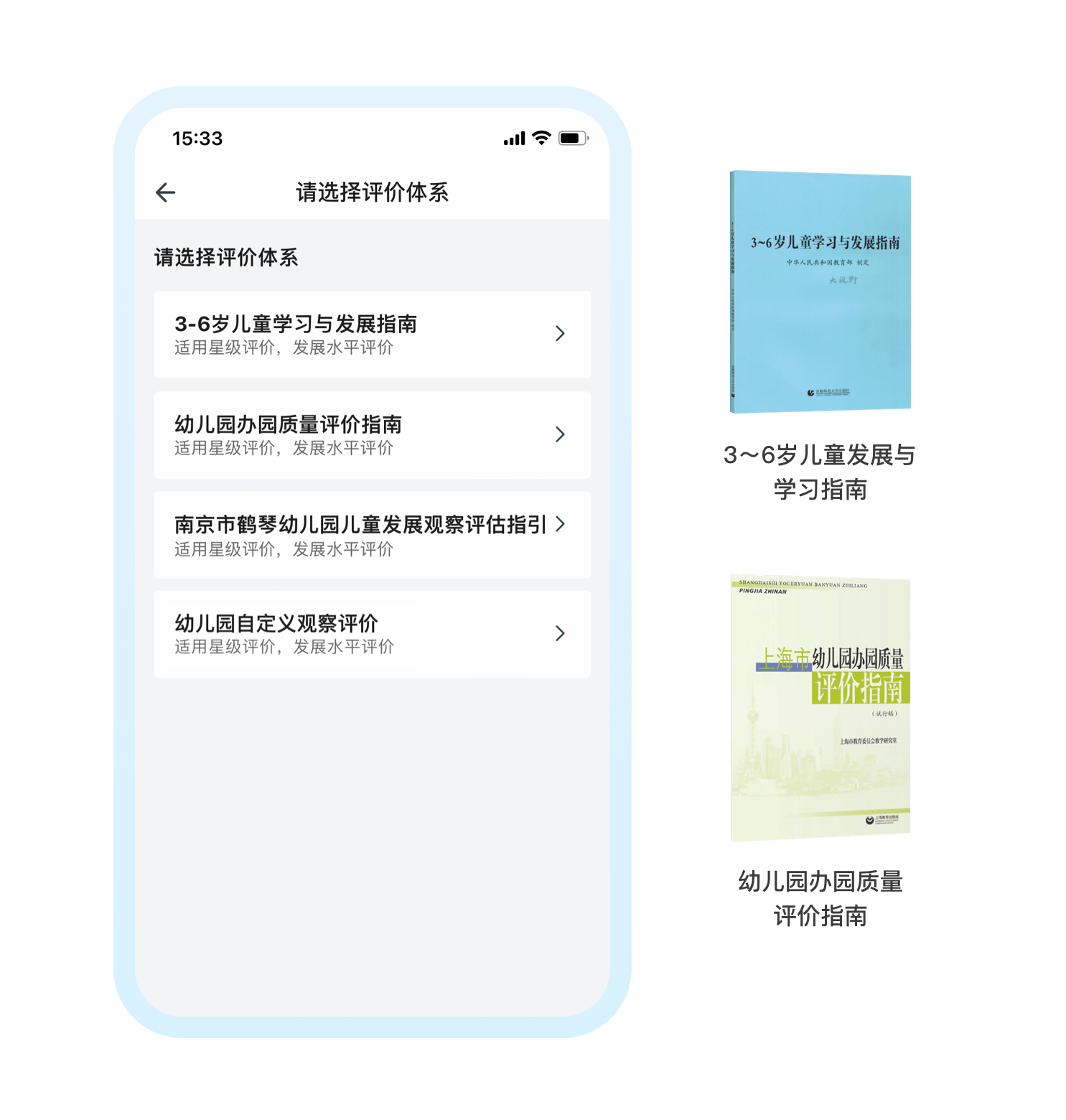 内置了3套应用广泛的评估体系,并给予老师1000+条不同发展阶段下的典型行为示例,园所可根据本园状况自由选用,也可根据园本课程自定义评价体系,满足个性需求。