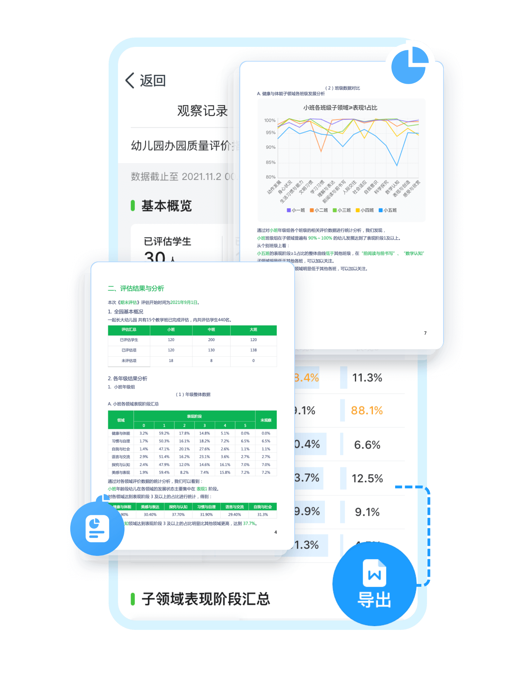 数据驱动园所课程建设,为幼儿发展提供有效策略。可自动生成“观察记录数据报告”、“综合评估数据报告”、“幼儿发展数据报告”。