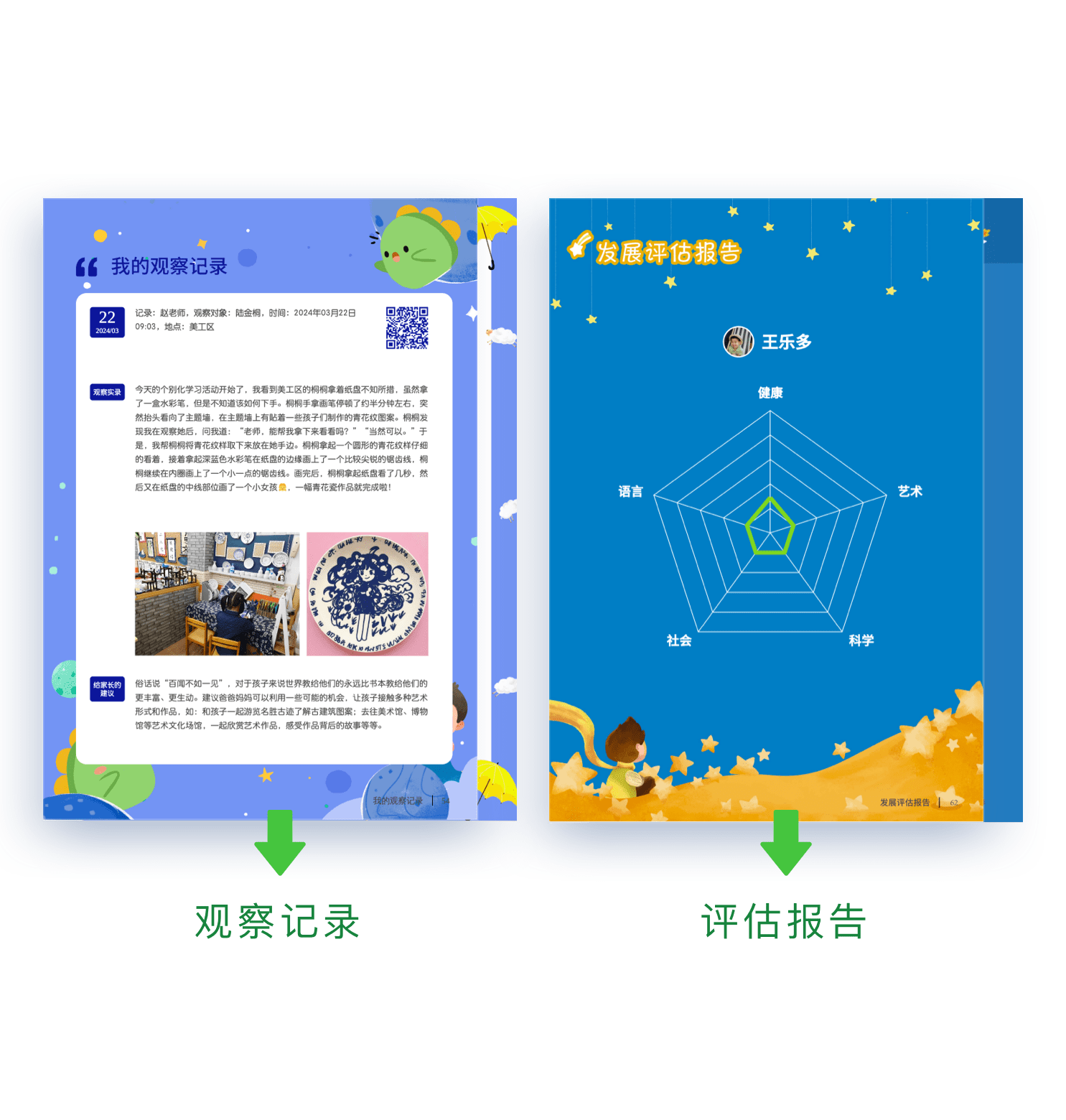 形成学期观察记录情况和幼儿发展评估报告,实现幼儿发展和教育成果可视化。