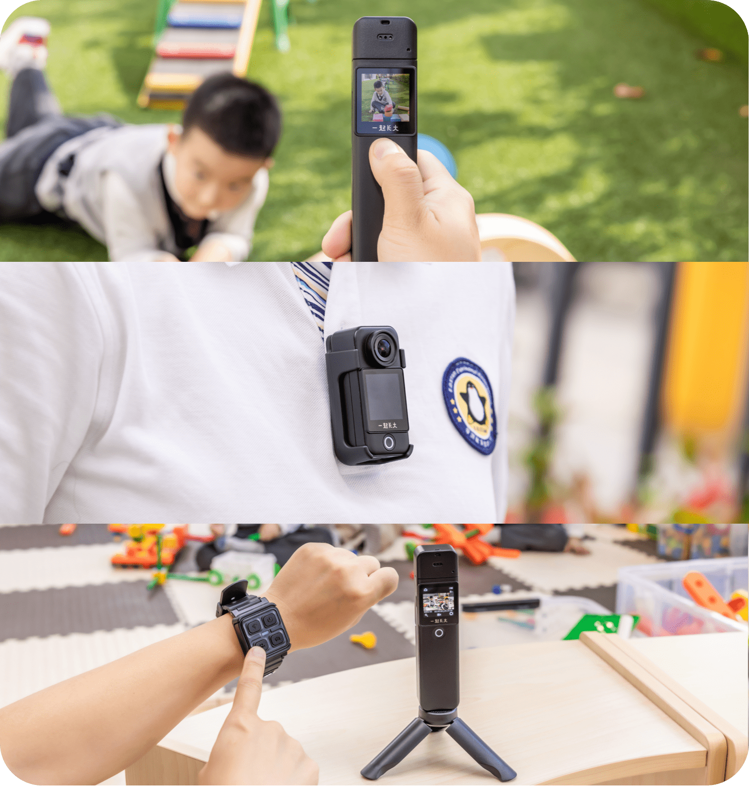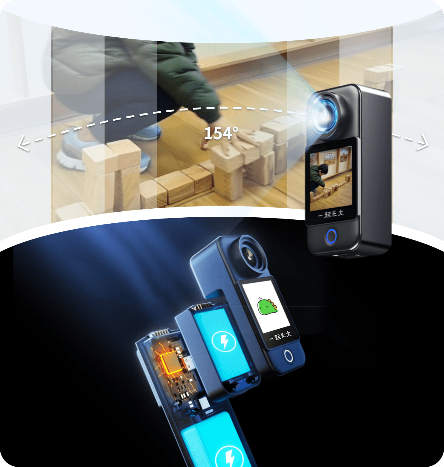 154°超大广角,1080P-2K高清画质,六轴陀螺仪防抖,支持边走边拍,2-4H超长续航可更换手持电池模块。