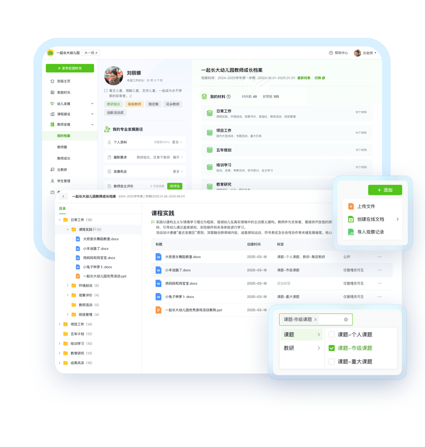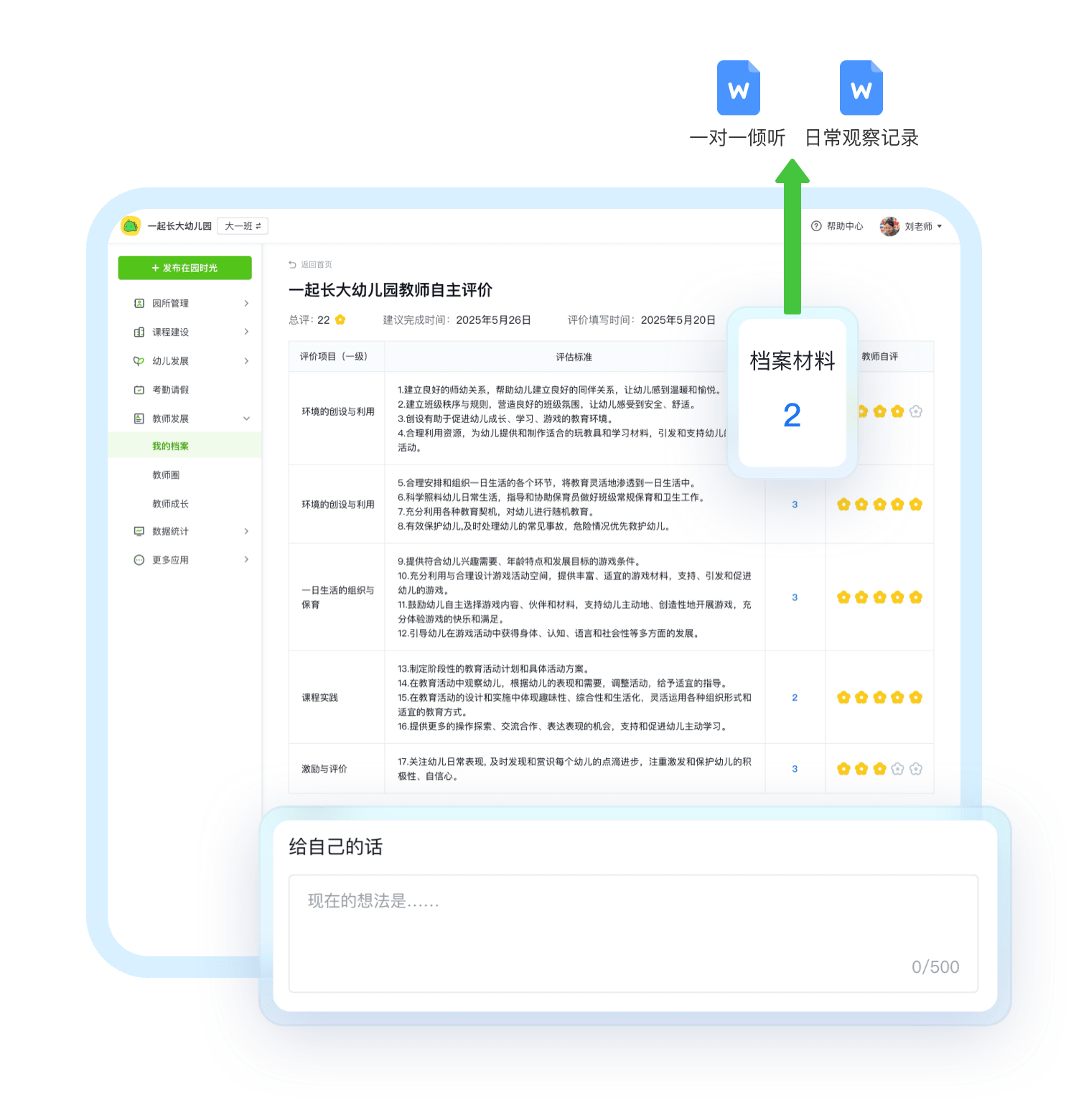 专属“成长档案空间”支持教师按照园所自定义标签,及时上传日常材料,资料实时关联考评项,形成佐证依据。沉淀资料,随用随调,提升效率。