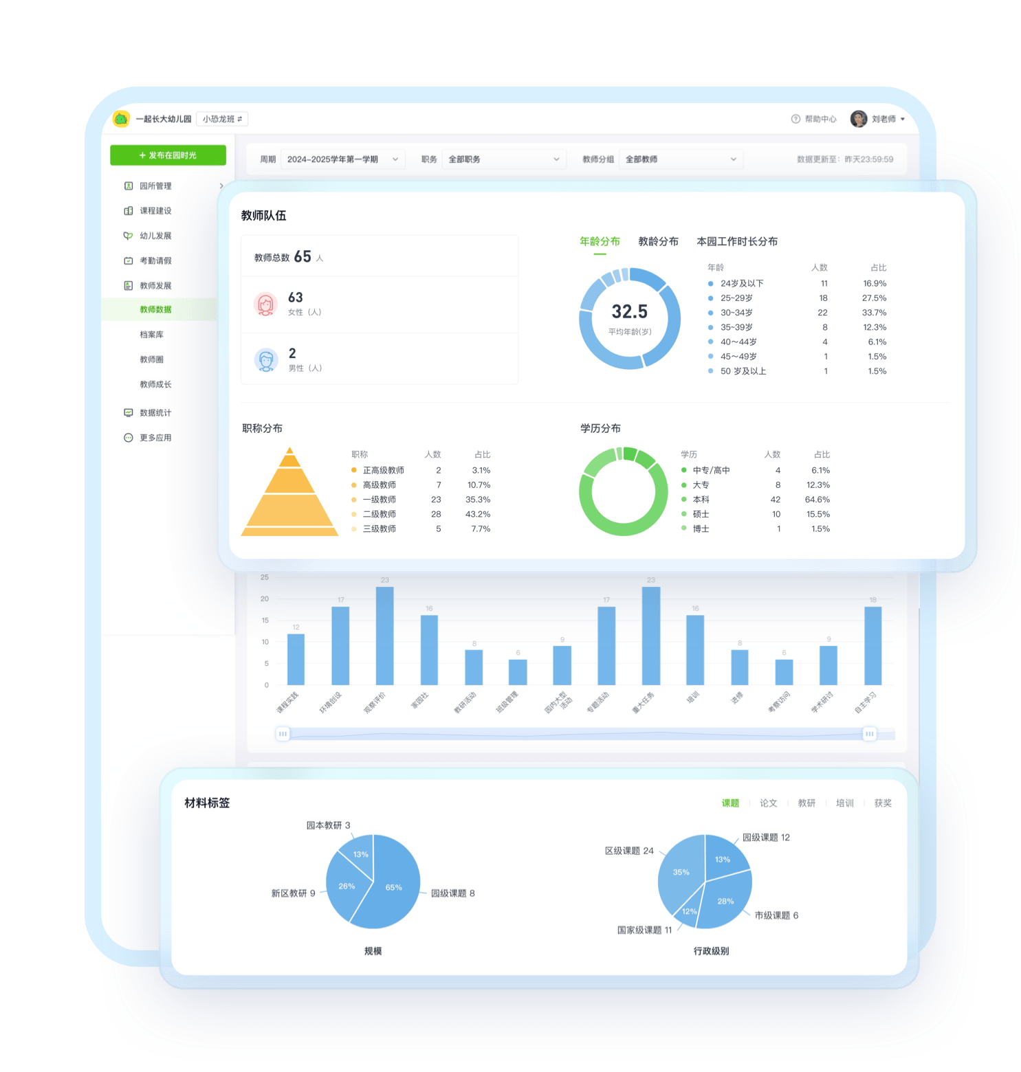 园所管理者可通过“教师发展数据看板”量化全园教师数据,直观掌握师资现状以及教师的动态发展状况为班级搭配优化、培训规划制定、考核标准调整等决策提供科学依据。
